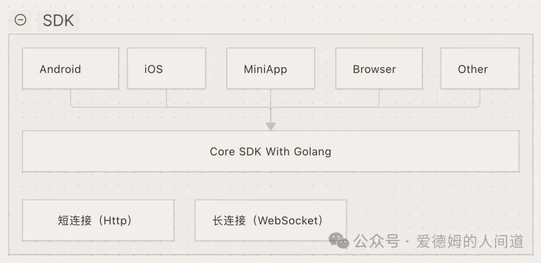 OpenIM的SDK支持多平台,核心使用golang编写,封装了对API服务请求,与长链接的处理逻辑。而各端的封装主要完成了客户端参数配置,与桥接Golang的部分。